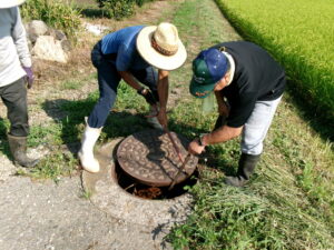 機能診断(用水の主要箇所の状況を確認しました) 草刈り(道路沿、水路の