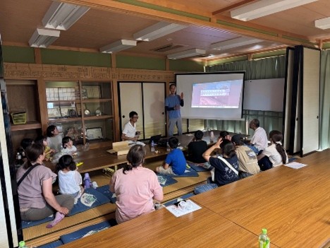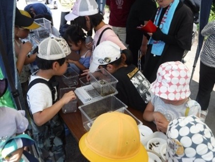 子どもたちは網を持って水路に入ると、魚の捕まえ方の指導を受けながら水中の生き物をたくさん採取しました。その後、アドバイザーから捕獲した生き物についての説明を受け、生き物について勉強しました。