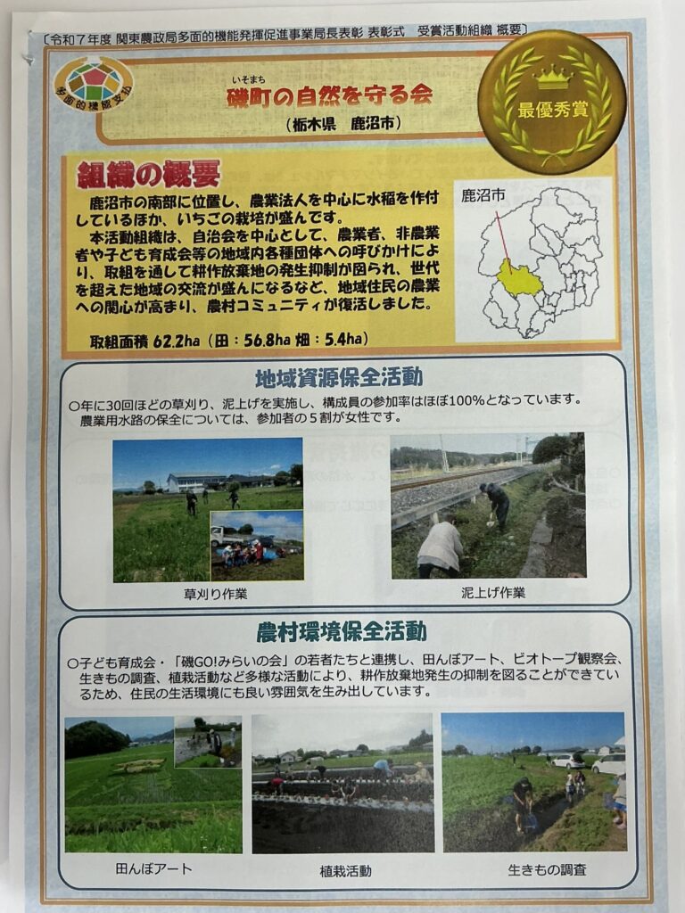 3月4日、令和7年度関東農政局多面的機能発揮促進事業局長表彰 表彰式・事例発表会が執り行われ、磯町の自然を守る会が最優秀賞を受賞しました!