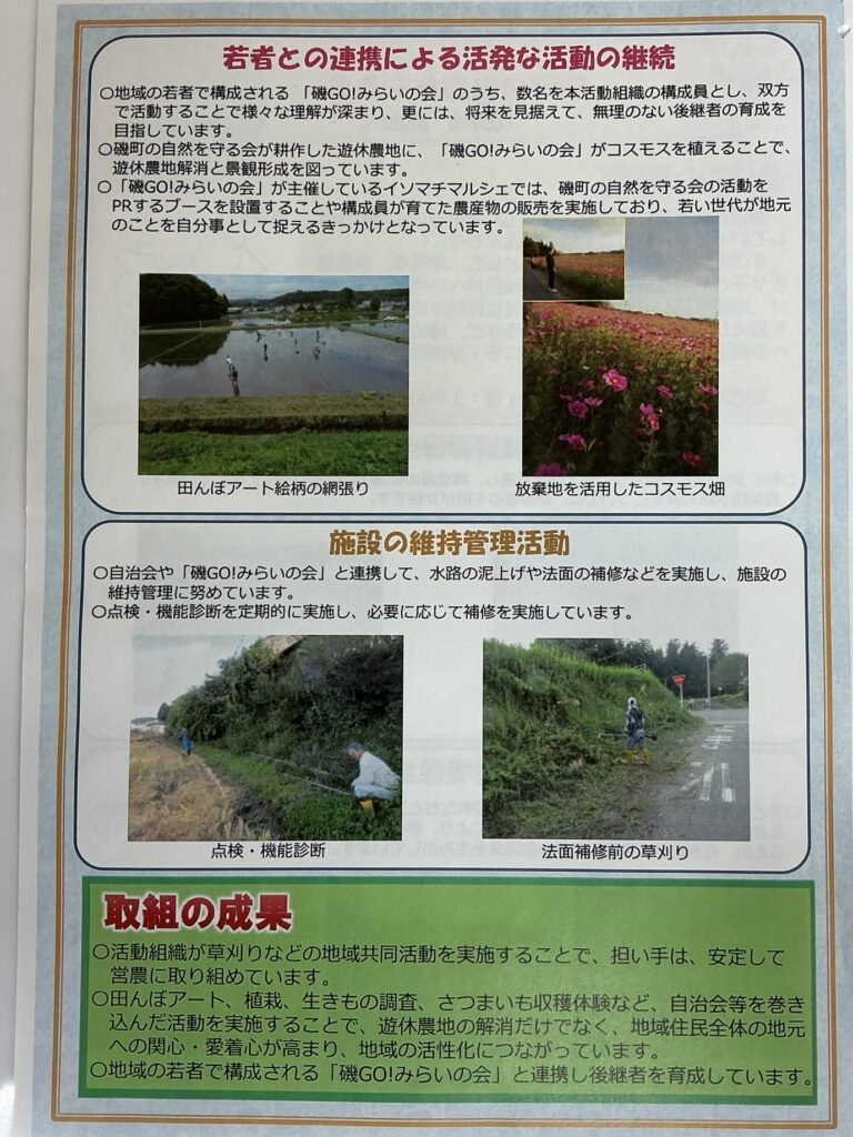 また、子供育成会や「磯GO!みらいの会」の若者たちと連携し、遊休農地へのコスモス植栽や田んぼアートなど、農村環境保全活動と地域農業の担い手確保を両立し、将来的な持続性を大きく高めている点も評価されました。