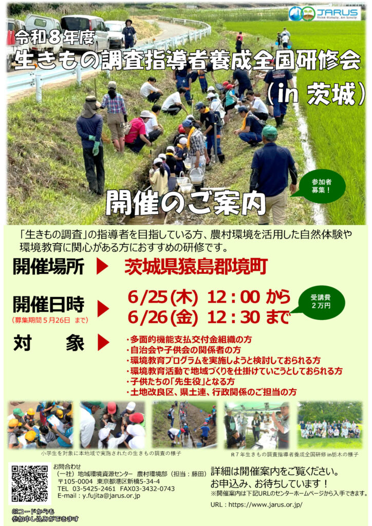 一般社団法人 地域環境資源センター主催の「生きもの調査指導者養成全国研修会(in 茨城)」が開催されます。